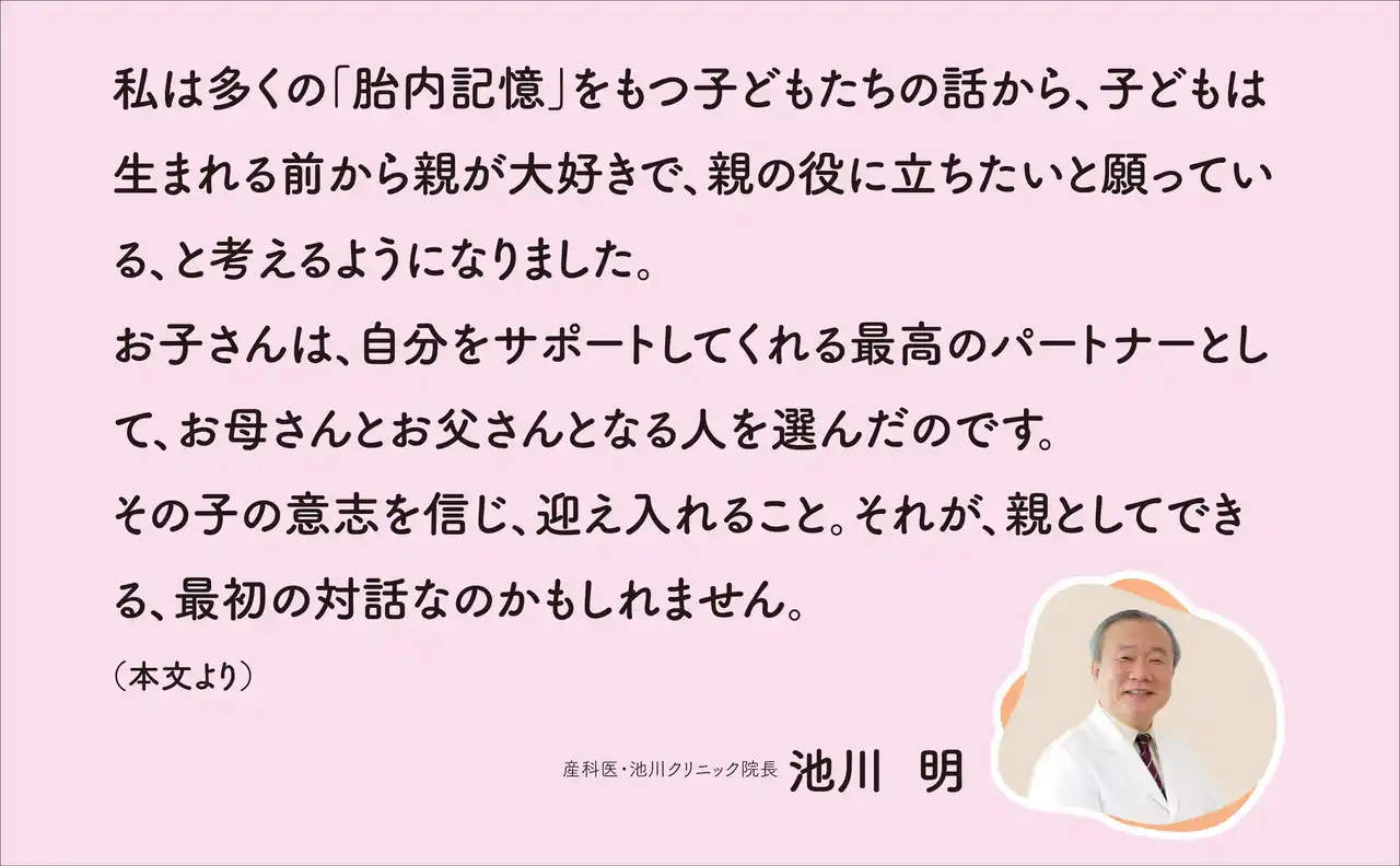 | 上尾中央総合病院産婦人科部長を経て、89年、横浜市に池川クリニックを開設。「胎内記憶」の研究発表がマスコミで紹介され、話題に。現在は、外来診察の傍ら、胎内記憶を世界に広めるための講演活動とセミナーを行っている。一般社団日本胎内記憶教育協会代表理事。アメリカ出生前・周産期心理学協会(APPPAH)会員。ドキュメンタリー映画『かみさまとのやくそく~あなたは親を選んで生まれてきた~』に出演。胎内記憶での活躍が評価され、Spirit of APPPAH Outstanding Advocacy、 Hall of Honor of Prenatal Sciences 受賞。『この世に生まれてきた大切な理由』(小社刊)、『ママのおなかをえらんできたよ。』(リヨン社)など、著書多数。 | ||||||||||||