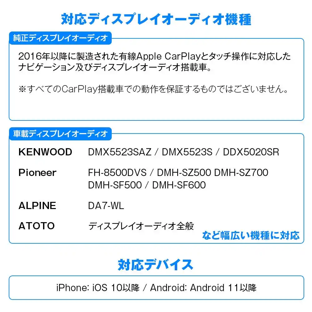 有線接続でCarPlay/Android Autoに対応し、タッチパネル操作が可能なディスプレイオーディオ搭載車両(一部車両を除く)。※輸入車(BMW・Volvo・テスラなど)・一部の国産車(MAZDA・SUZUKI・NISSANなど)は非対応の場合があります。詳細は製品ページをご確認ください。 |