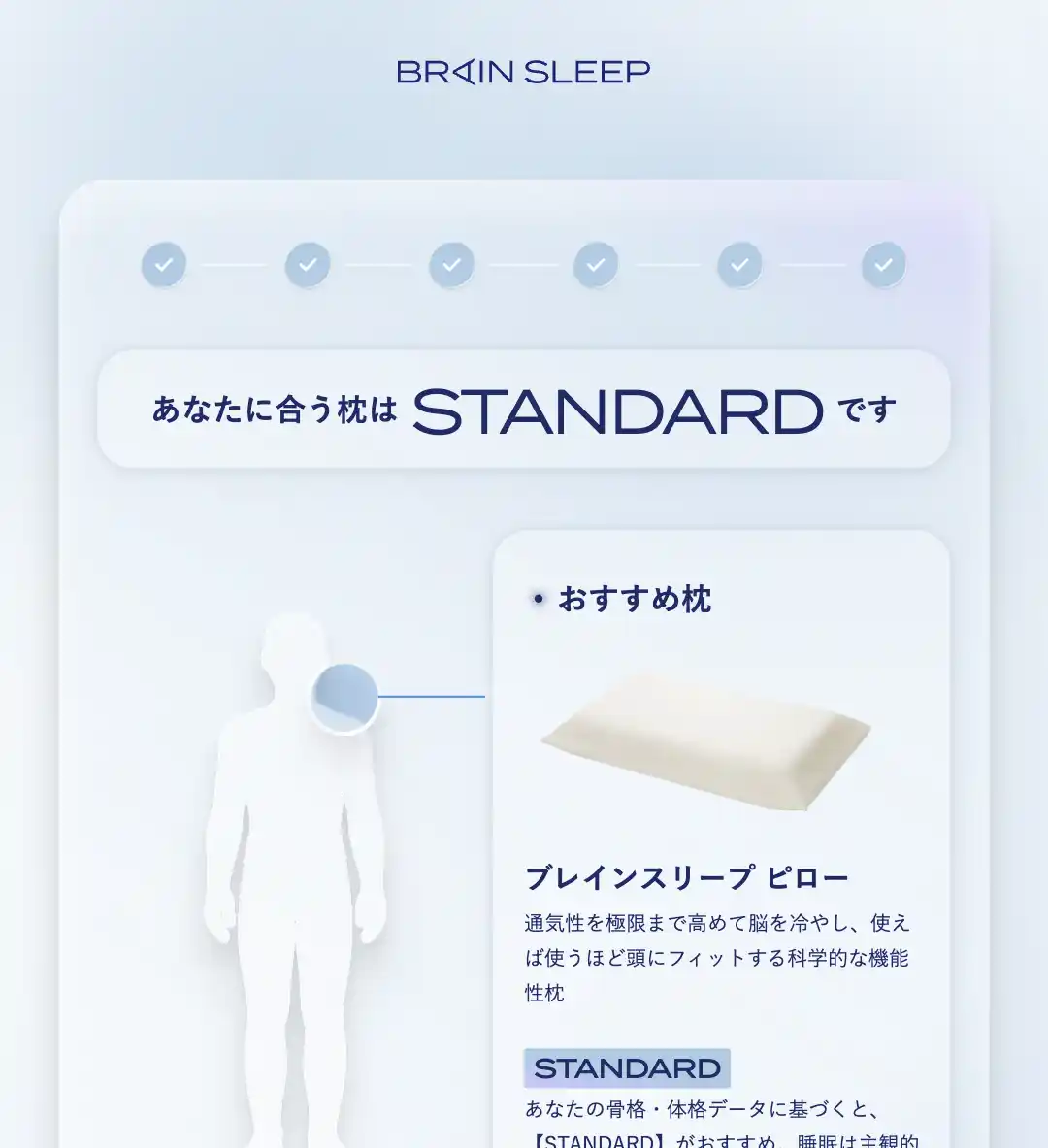 | ブレインスリープが蓄積してきた知見・データ・テクノロジーを集約した独自の体験型オリジナルサービスをご用意しています。また、「ブレインスリープ ピロー」をはじめとするプロダクトの高さや形状、質感の違いなどを、個別空間でリラックスしながらご体感いただけるスペースもご用意。プロダクトやサービスの体験を通してご自身の睡眠を知り、課題を解決する方法をご提案いたします。 | ||||||||