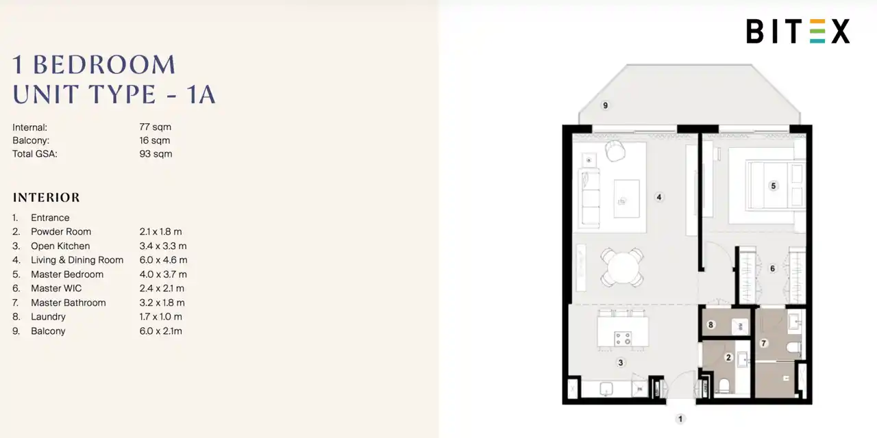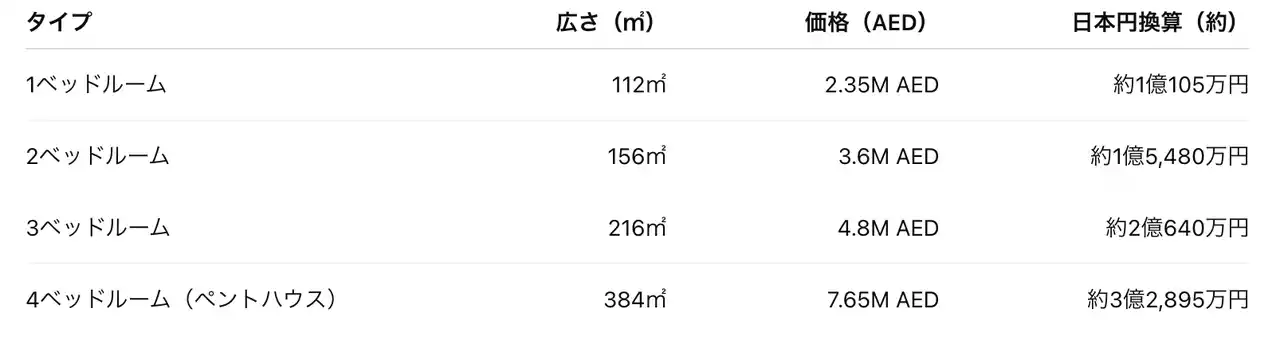 | 1ベッドルームでも80平方メートル を超えるゆとりある設計で、最大468平方メートル の大型ペントハウスまで展開しており、日本の都心物件と比べても圧倒的な広さを誇る点が大きな魅力です。 | ||||||||||||||||||