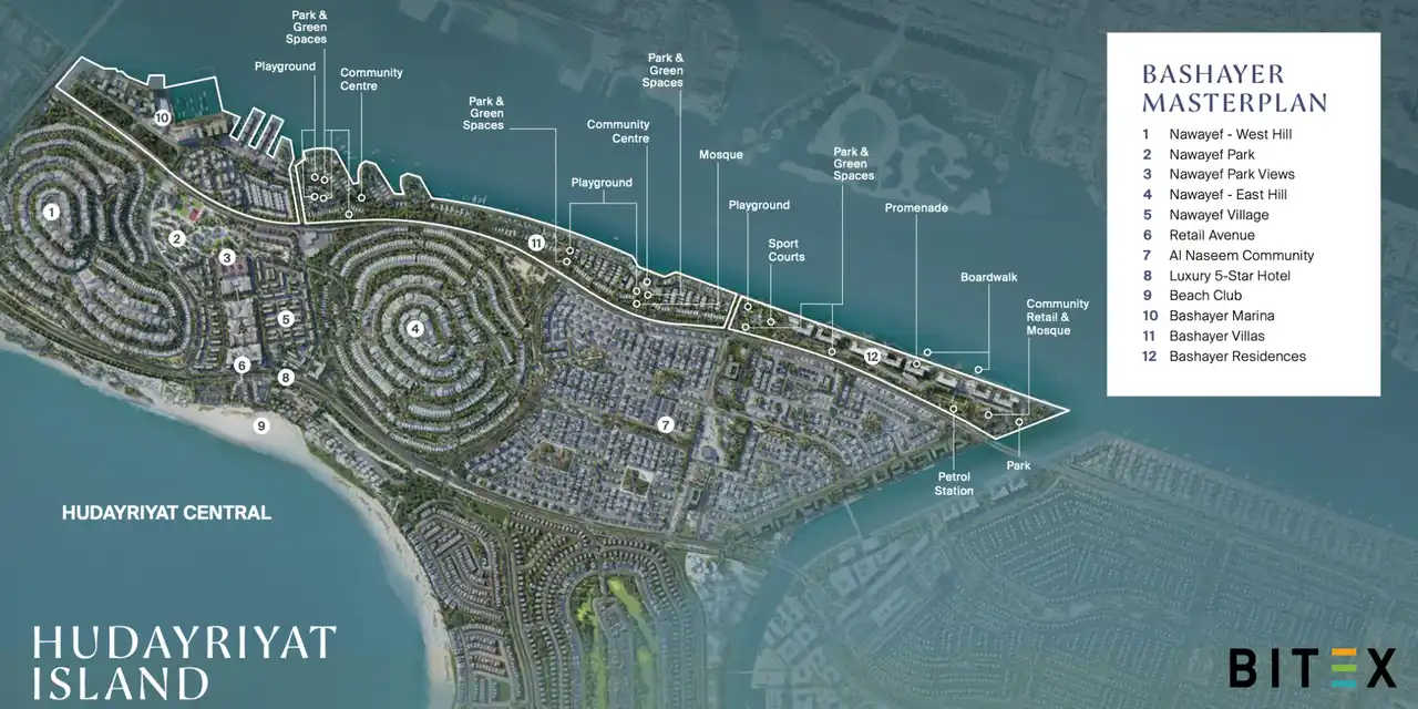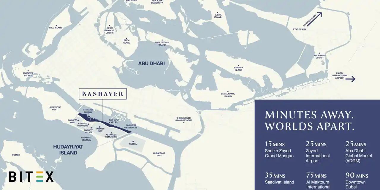 | 「Bashayer Residences」は、アブダビ・フダリヤット島に位置するウォーターフロントレジデンスです。海に面した開放的なロケーションと、モダンで洗練された建築設計により、日常の中でリゾート感を楽しめる設計が特徴です。 | ||||||||||||||||||