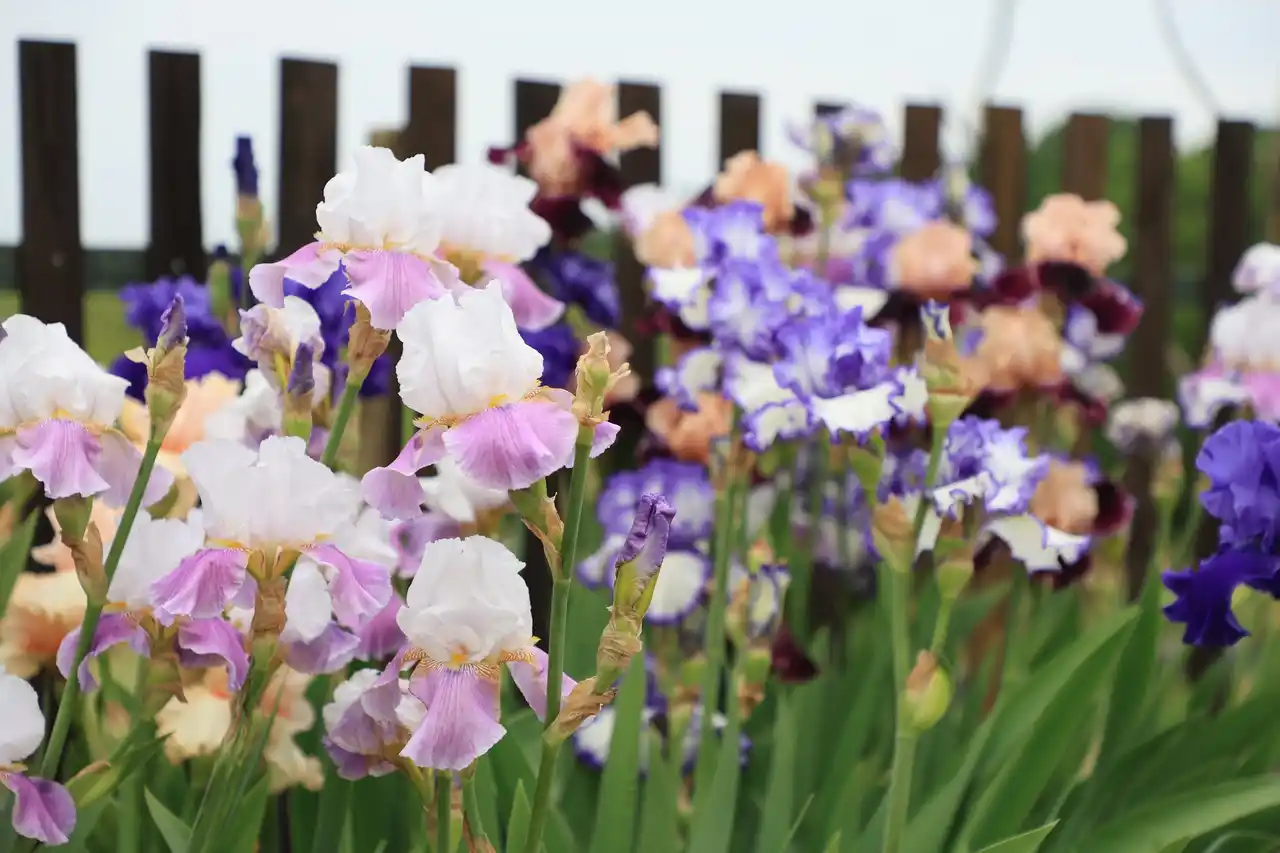 約120種類のアヤメ類を植栽。なかでも「虹の花」とも呼ばれる「ジャーマンアイリス」はドレスを纏ったような上品な花姿・色・香りが特徴です。(写真は2025年の様子) |