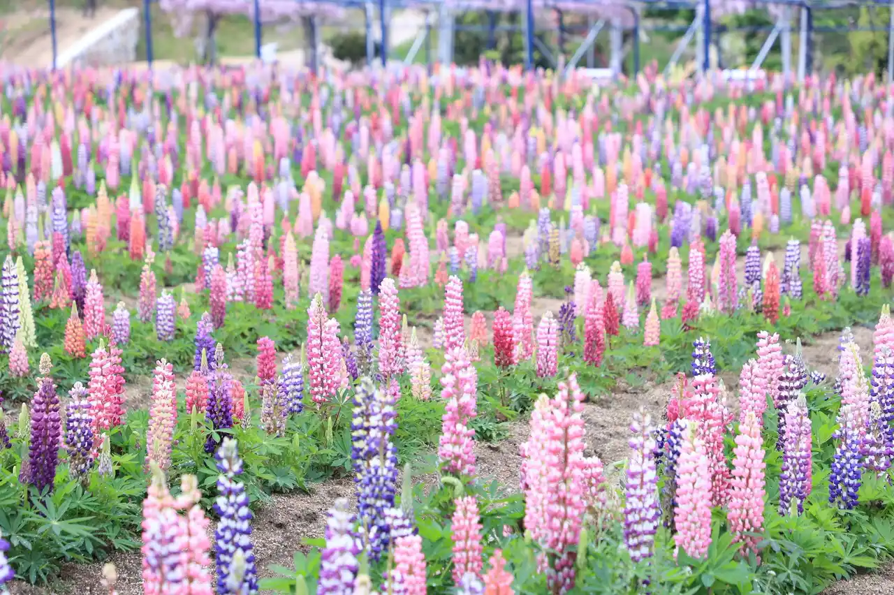 ルピナスは蝶々のようなカラフルな小花が集まった花穂が特徴です。彩り豊かなルピナスが一面に咲き広がります。その甘い香りも楽しんでください。(写真は2025年の様子) |