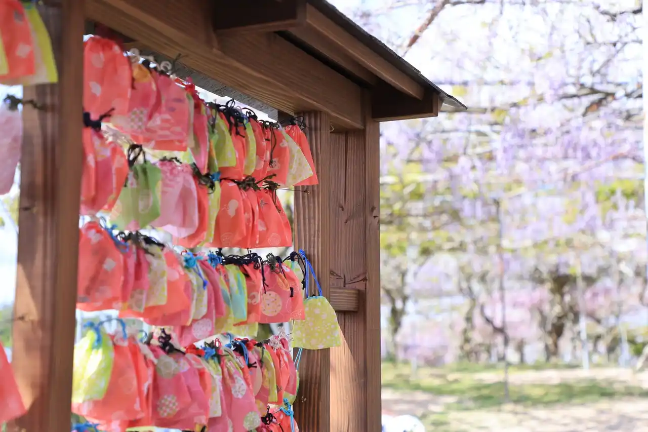 願いを描いた紙を手作りの巾着袋に入れて掛け処におかけください。御神木があなたの願いを優しく見守ります。 |