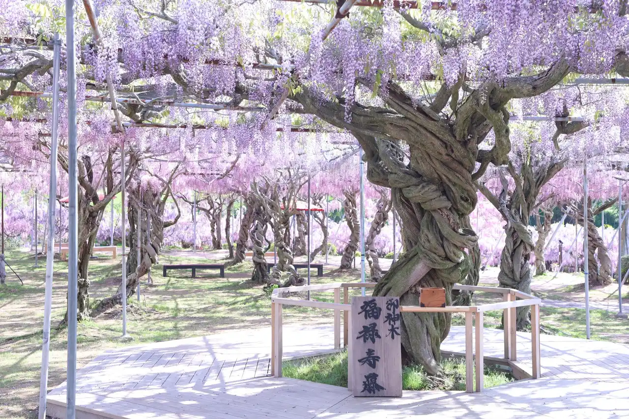 樹齢約50年の御神木「福禄寿藤」は園内一の大藤。巨木の迫力を間近で感じることができます。みなさまの幸運(福)金運(禄)長寿(寿)を願って命名されました。(写真は過去の様子) |