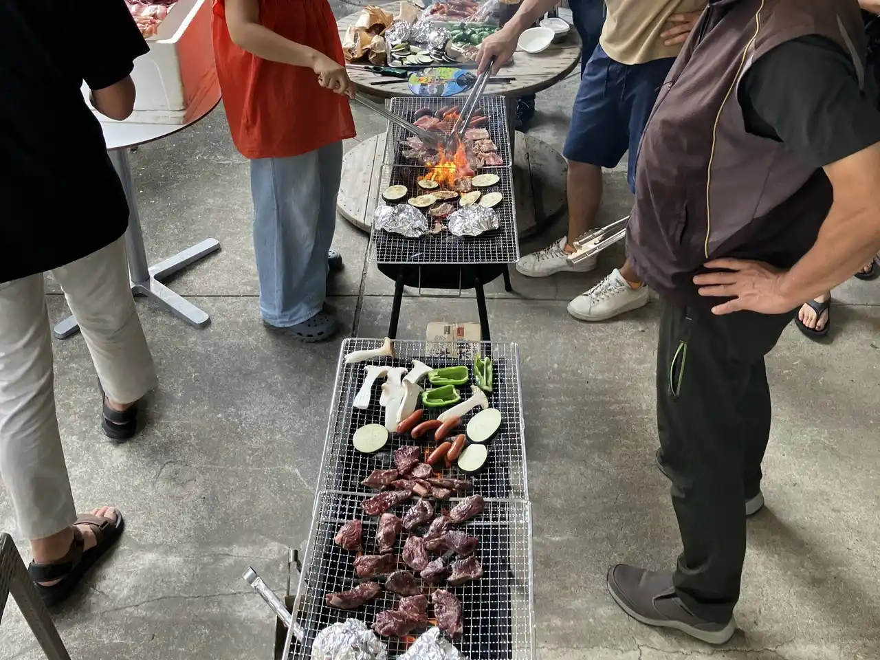 バーベキューでは、牛バラ肉や豚トロ、鶏モモ、ソーセージといったボリュームのあるお肉に加え、野菜やおにぎりを用意。机や椅子、コンロ、炭、食器類など必要な道具一式も揃っており、手ぶらで気軽に楽しめるのも魅力です。お好みの食材や飲み物の持ち込みも可能で、自由度の高いアウトドア体験を楽しめます。 |
