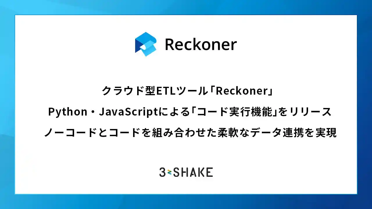 株式会社スリーシェイク(本社:東京都中央区、代表取締役社長:吉田 拓真、以下スリーシェイク)が提供するクラウド型データ連携ツール「Reckoner(レコナー)」は、データ連携フロー内でPythonおよびJavaScriptのコードを記述し、独自のデータ処理を実装できるコード実行機能をリリースしたことをお知らせします。本機能により、GUIベースのノーコード操作によるデータ連携に加え、コードによるカスタム処理を組み合わせた柔軟なデータ連携が可能になります。
