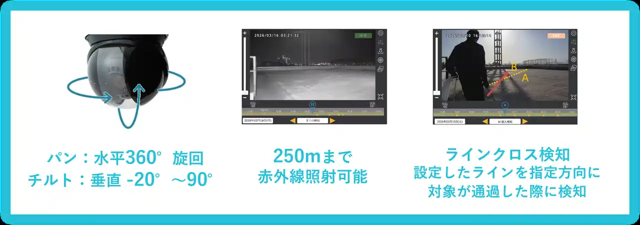 建設現場では、近年犯罪や不審行動が高度化し、夜間や暗所も含む24時間の監視体制が重要視されています。 キッズウェイでは「夜間・暗所でも“確実に視認できる”こと」と「異常兆候の早期発見」を両立できるカメラを求める声が多数寄せられていました。これらの課題を解決すべく、広範囲の遠距離監視に優れた赤外線PTZに加え、AIによる自動検知を搭載した新モデルを開発いたしました。 |