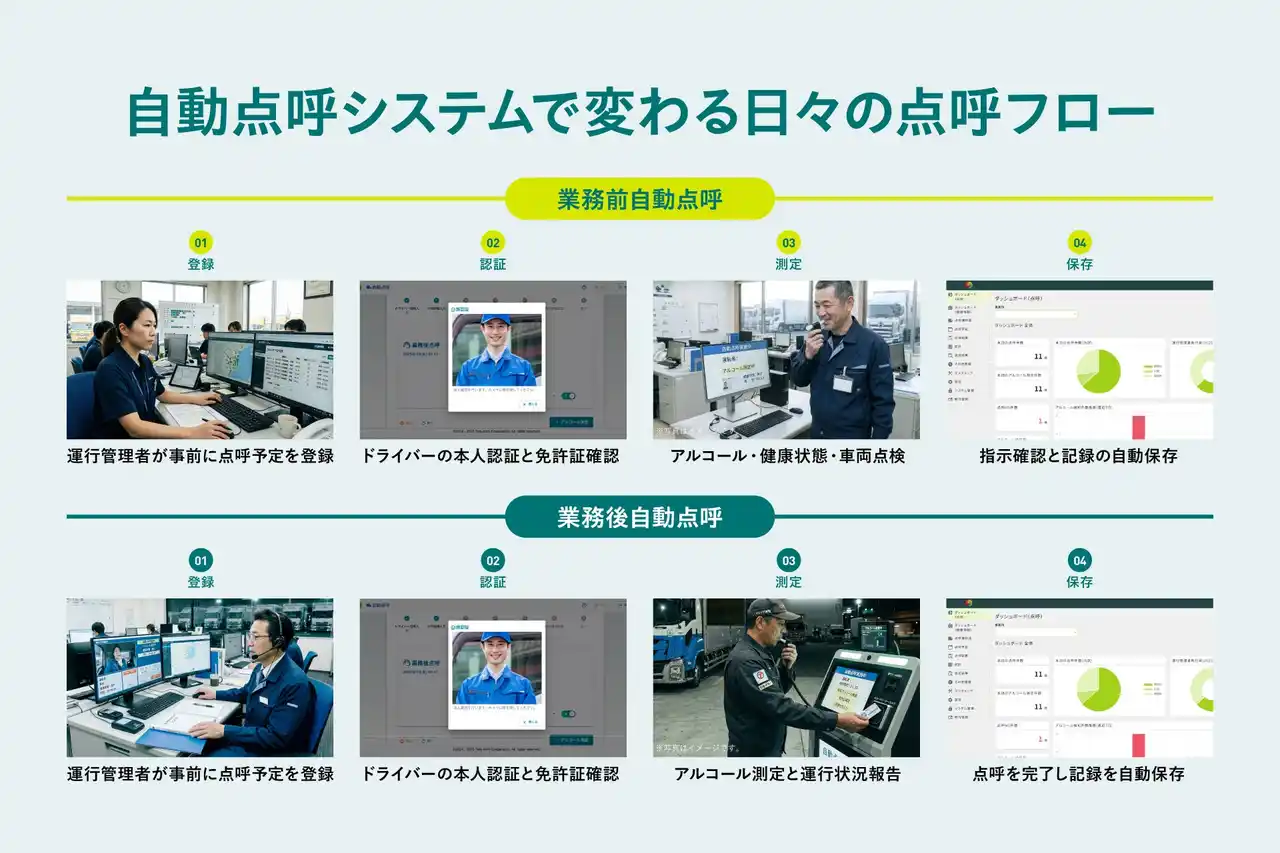 運行管理者の立ち会いは不要です。帰庫後、ドライバーは機器の前に立ち、画面の案内に従って操作するだけで、簡単・確実に業務後点呼を完了できます。 |