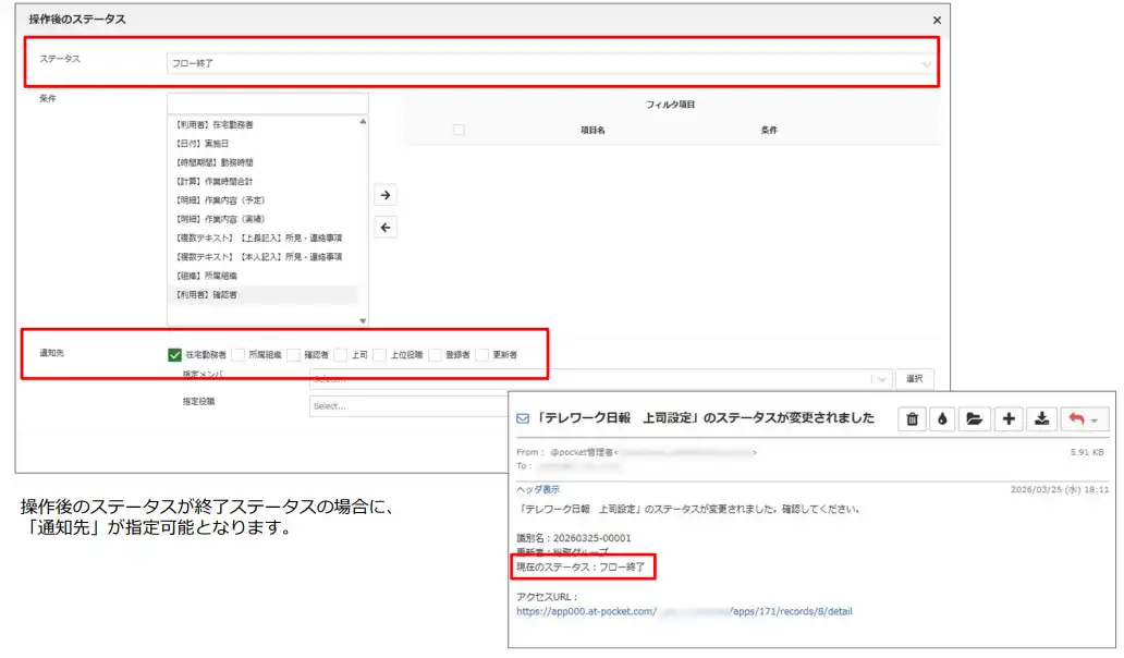 プロセス管理のステータスの終了時、通知対象者を選択して通知ができるようになります。 |
