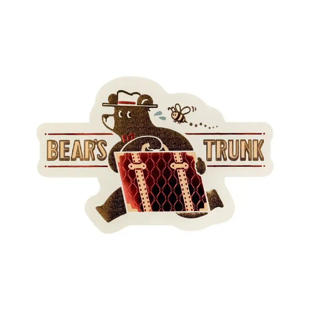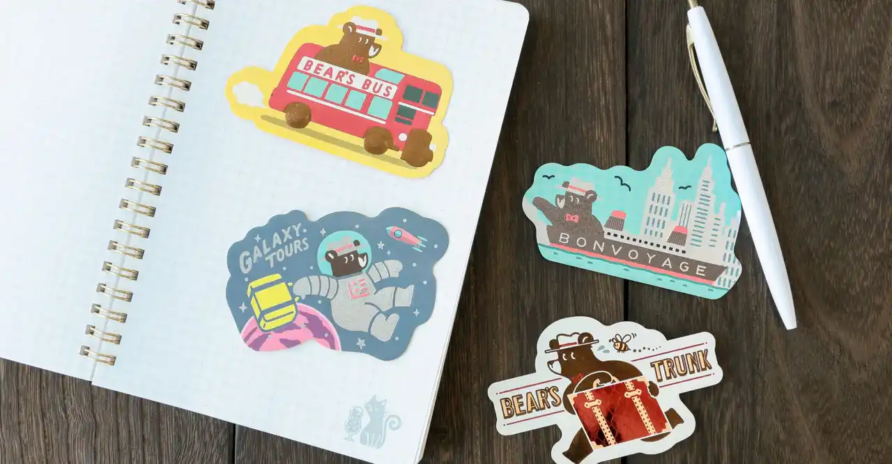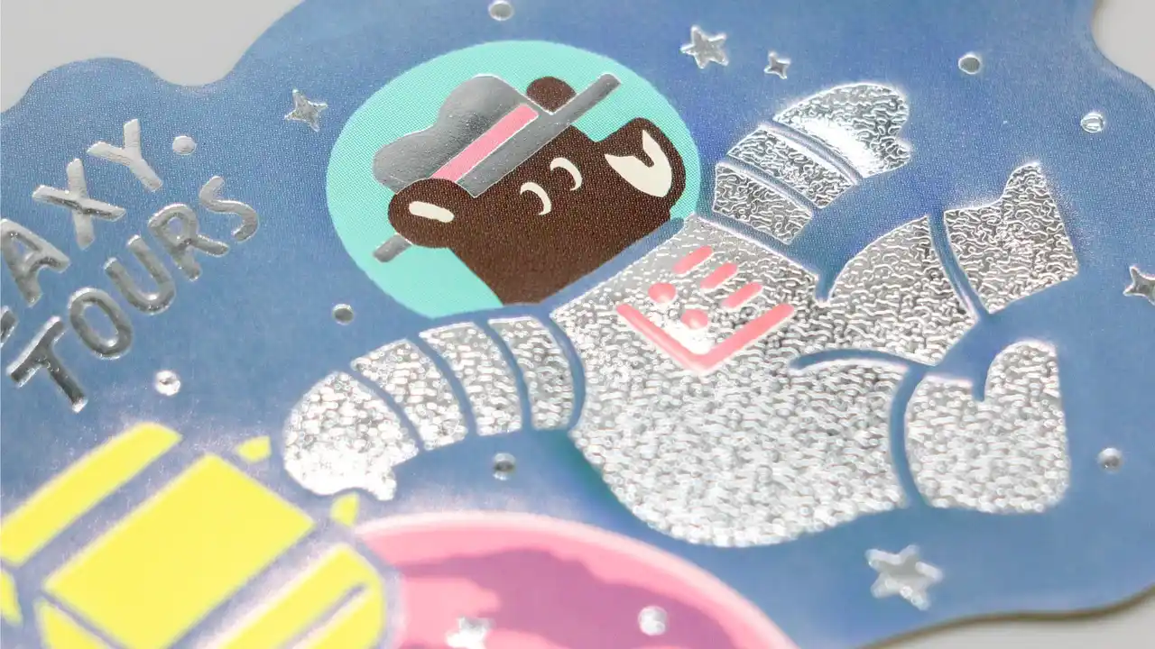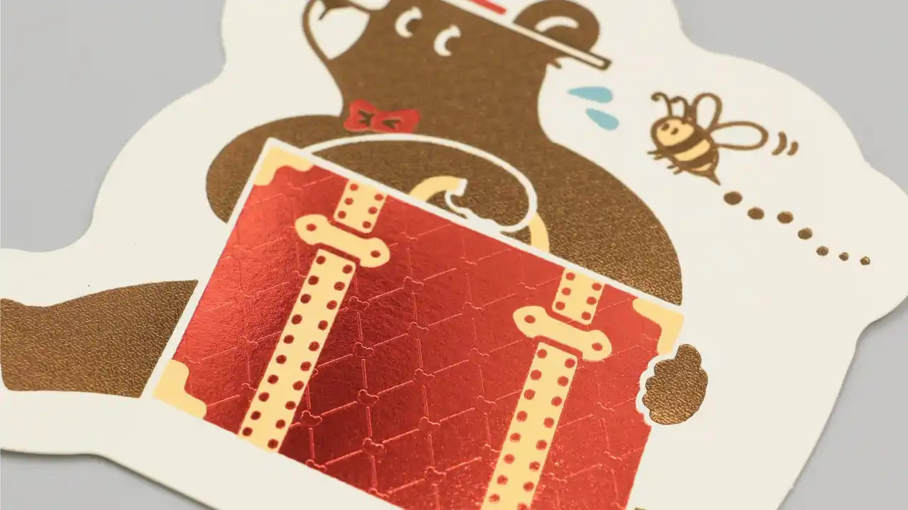 | 旅を続けるクマのワンシーンを、きらきらと輝く箔押しが彩るダイカットステッカーです。 | ||||||||||||