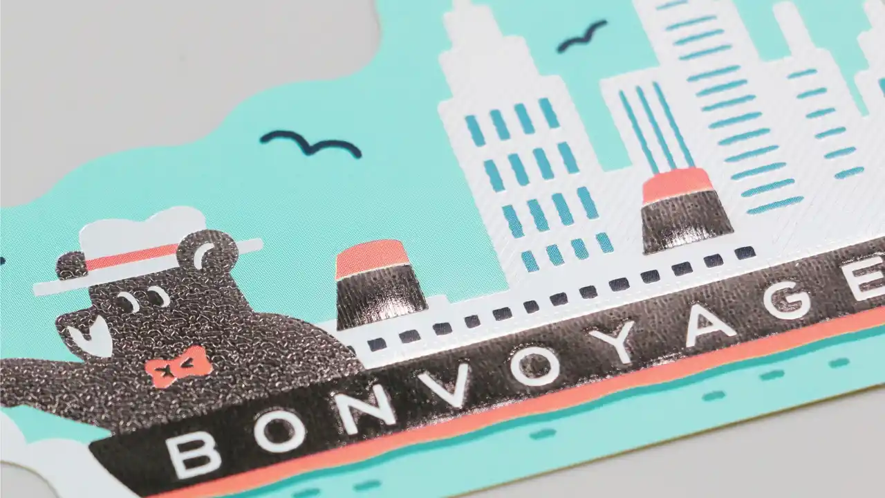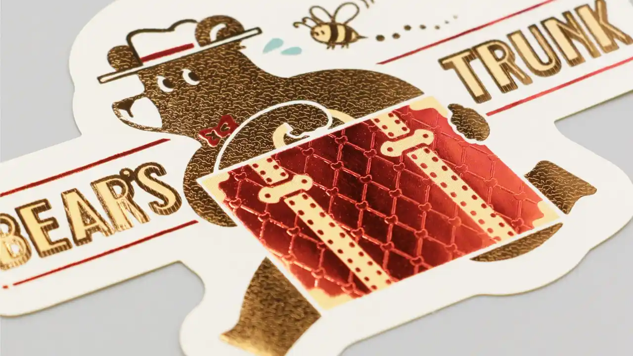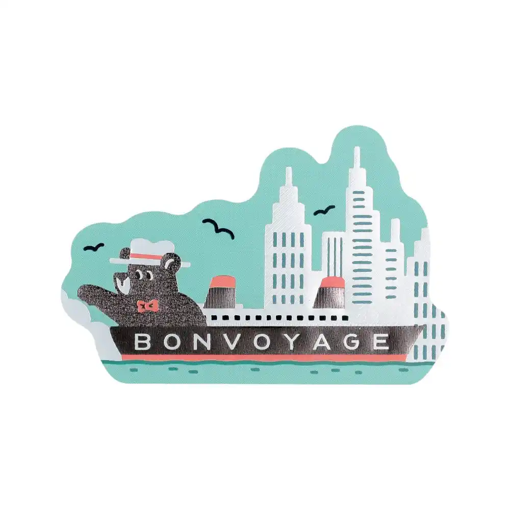 | 旅を続けるクマのワンシーンを、きらきらと輝く箔押しが彩るダイカットステッカーです。 | ||||||||||||
