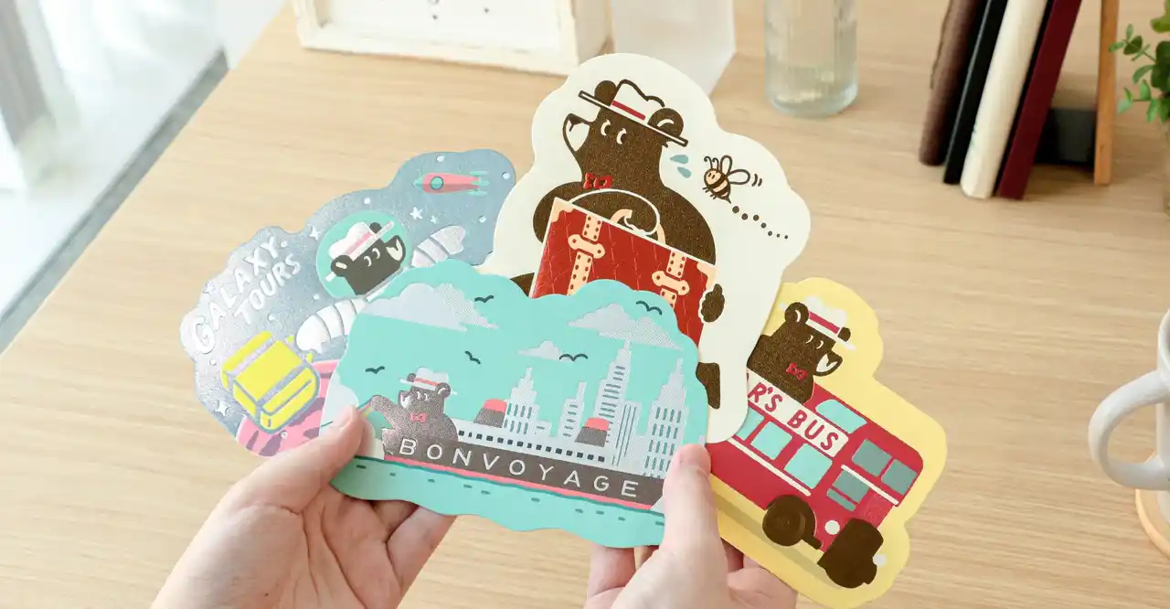 | イラストレーター兼グラフィックデザイナーとして活躍中のob1toy(オビワン)と箔押しブランドROKKAKUのコラボ。「TOURSシリーズ」より、海から陸、そして宇宙まで旅を続けるクマを描いた「ダイカットポストカード」と「ステッカー」が新登場! | ||||||||||||
