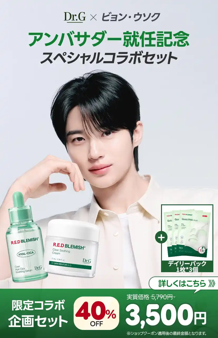 Qoo10では、ビョン・ウソクさんのグローバルアンバサダー就任を記念したお得なセットをご用意。4月13日(月)~4月30日(木)限定で、<レッドブレミッシュ クリアスージングクリーム>と<レッドブレミッシュ ヒアルシカスージングセラム>のセットをお買い上げの方に、<レッドブレミッシュクイックPHAシートマスク(3枚)>をプレゼントします。 |