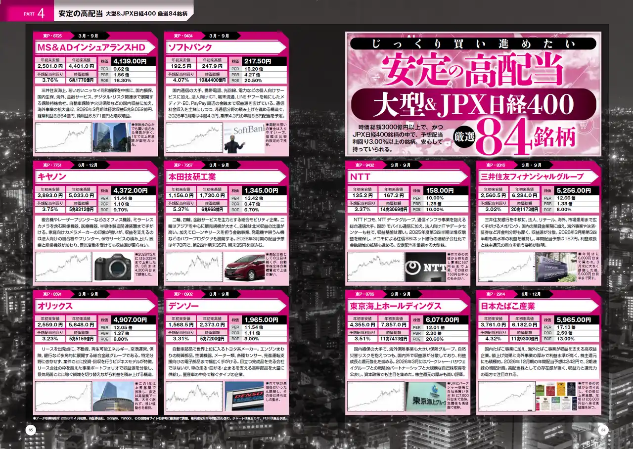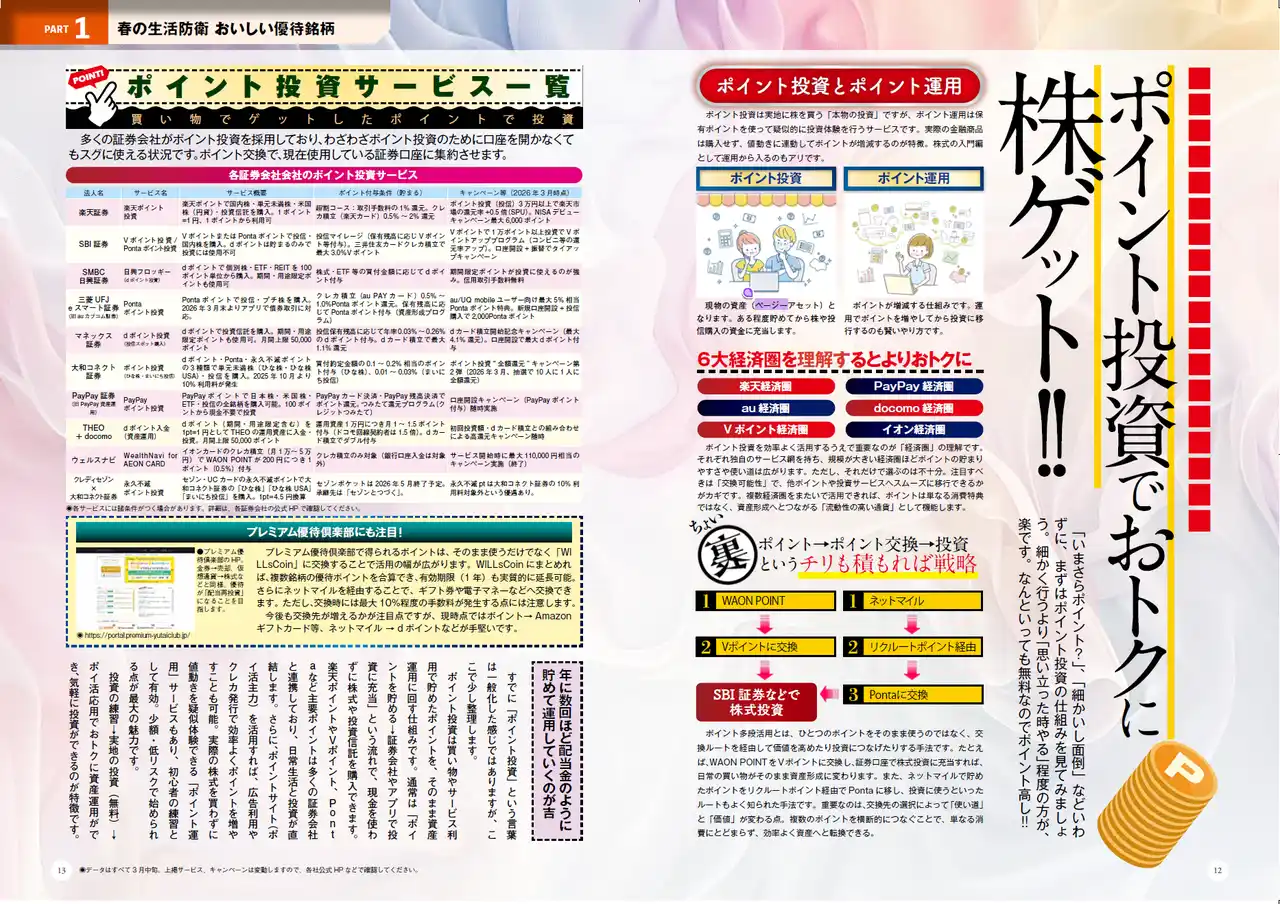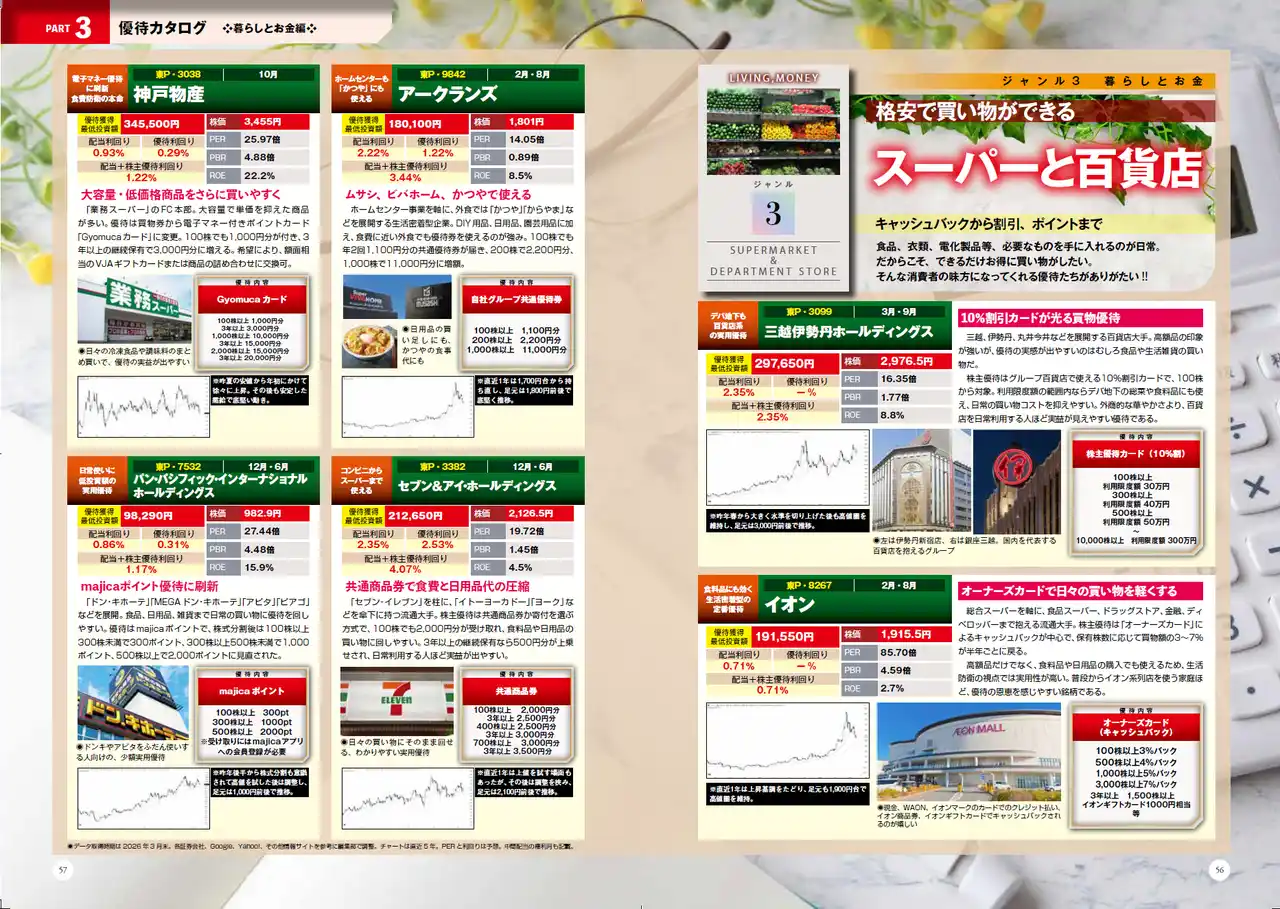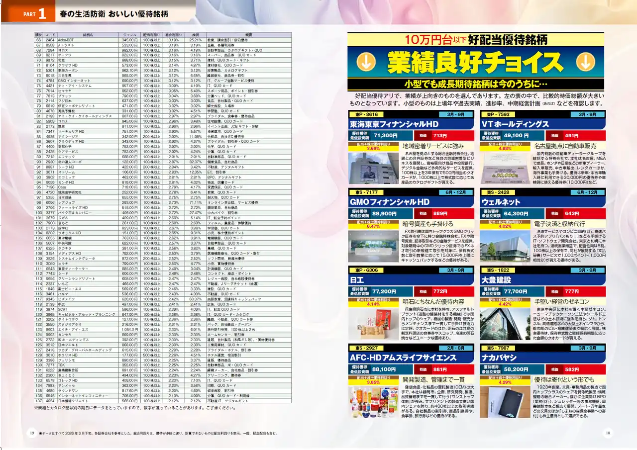 巻頭は「春の生活防衛 おいしい優待銘柄 267 銘柄ランキング付き!!」。QOLを目指して生活コスト改善&おいしい銘柄を網羅。総合利回りもわかるので、各銘柄の優待のおトク度も一目瞭然です。ポイント投資や隠れ優待まで網羅しています。 |