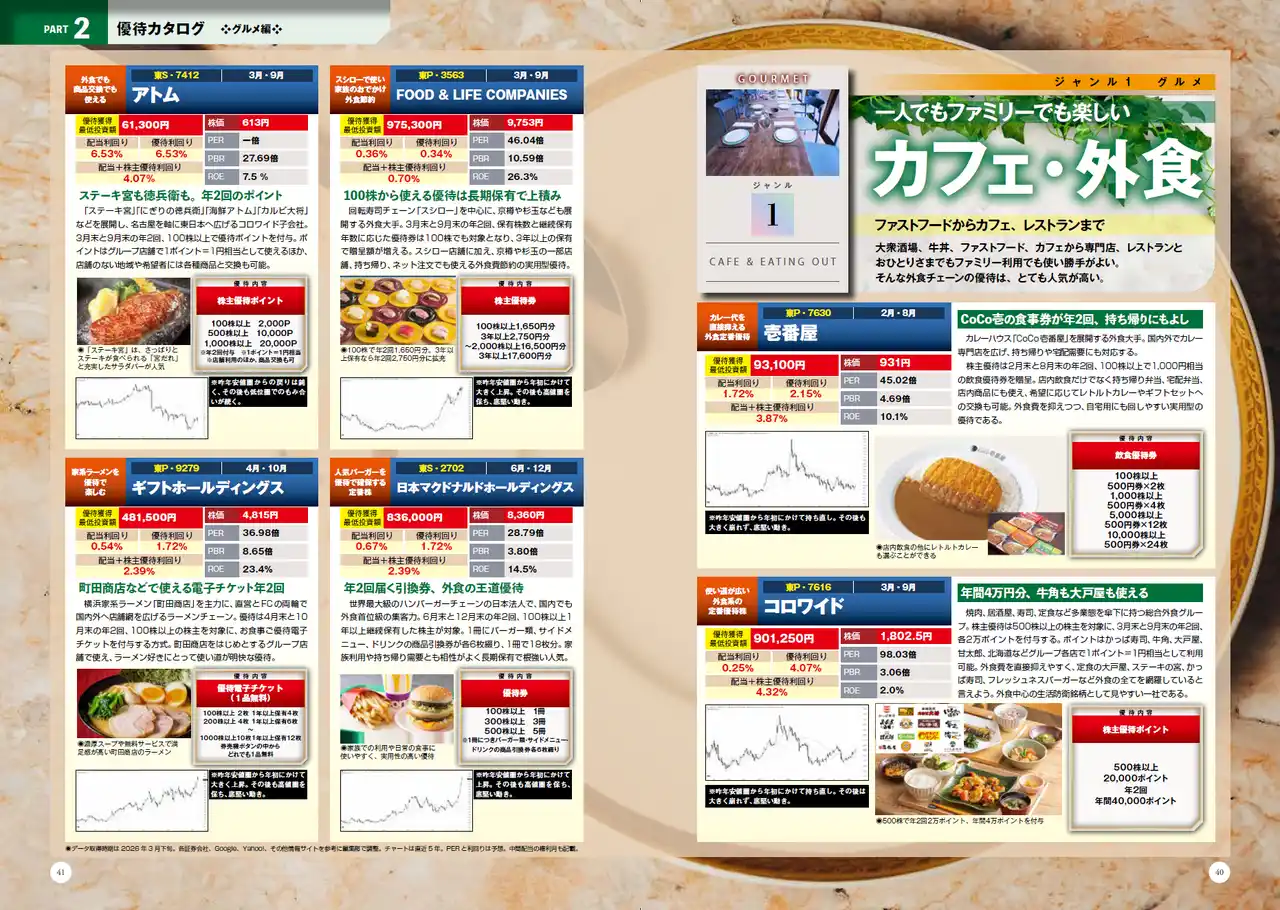 本編の優待カタログでは、グルメ編、遊びとお出かけ編、暮らしとお金編とジャンル分けし、それぞれ代表的な銘柄をチョイスしました。銘柄選びに役立ててください。 |