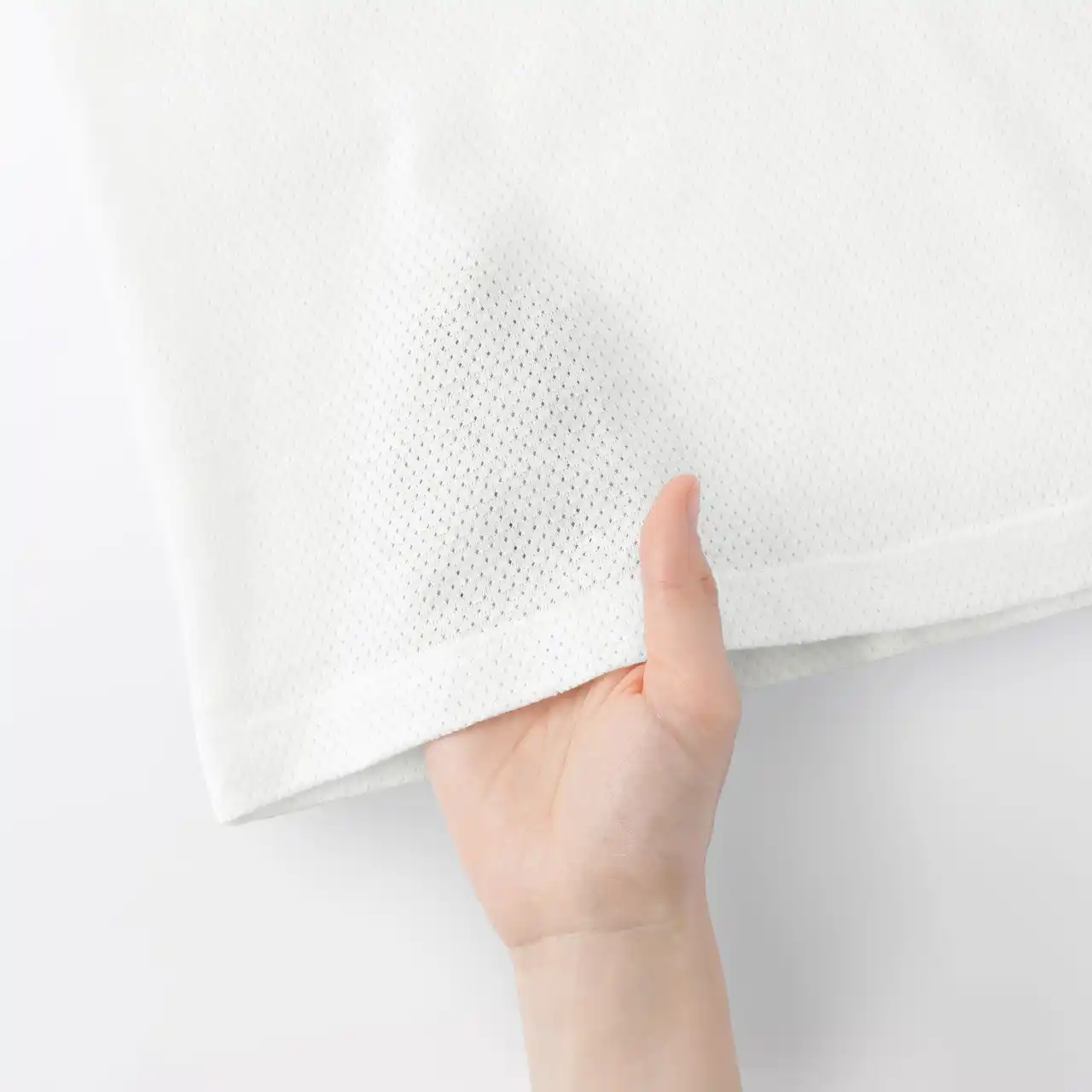 前閉じ部分は生地を二重にすることで、メッシュ編みでも透けにくい仕様にしています。夏の日常や通勤時など、汗をかきやすい場面でもさらりと着られ、長時間の移動やオフィスで過ごす時間にも取り入れやすいインナーです。蒸れを抑えたいビジネスシーンや、外出が続く日にも心地よく過ごせます。綿はオーガニックコットンです。 |
