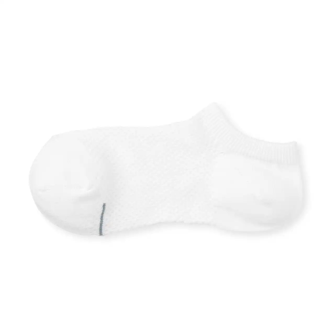 生地に蒸れにくい素材を使い、通気性のある全面メッシュ編みにしました。汗の臭いを抑制する裏糸を使用しています。クローゼットに収納した後も識別できるよう、つま先にラインを入れました。綿はオーガニックコットンです。 |