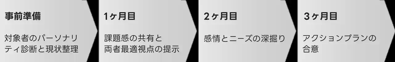 キーマン連携強化の標準ステップを解説します。キーマン2名に当社コンサルタントが伴走する「3者対話」を軸に、率直な議論と合意形成を促進します。コンサルタントが介入することで、対象者のパーソナリティーに寄り添いながら、客観的で新たな気づきを提供します。具体的なプログラム内容は、毎月の「3者対話」と「個別フォロー面談」にて構成されています。 |