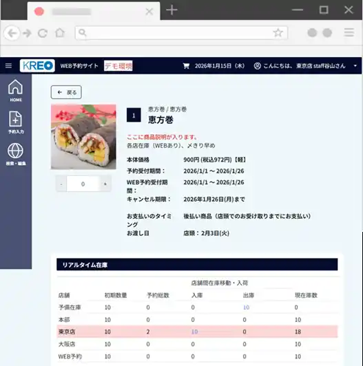 在庫移動や増減も即時に反映され、予約締切直前の販促強化にも繋がります。 |