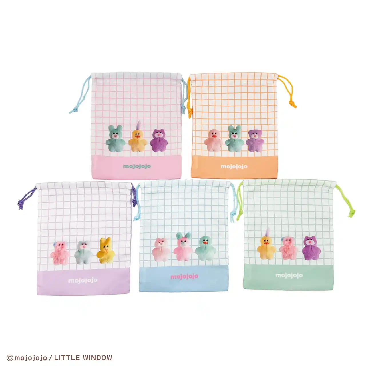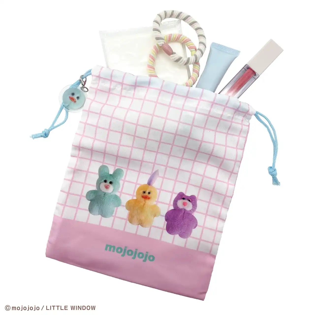 かわいいぬいぐるみたちがデザインされた『mojojojo』のアクリルチャーム付き巾着。 |