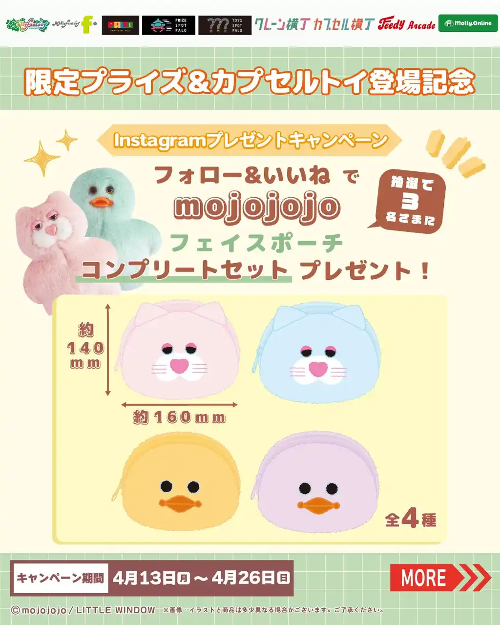 また、限定カプセルトイ用商品の展開を記念し、モーリーファンタジー公式X・Instagram で「mojojojo フェイスポーチコンプリートセット」が当たるプレゼントキャンペーンを開催いたします。 |