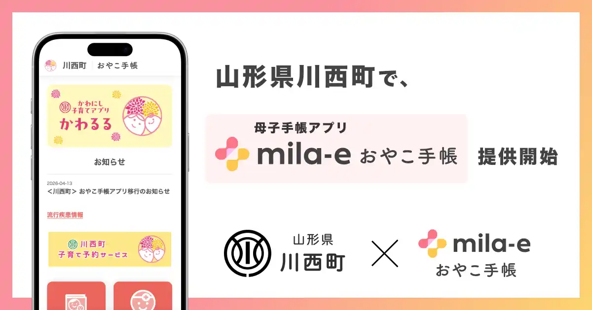 自治体向けサービスを開発する株式会社ミラボ(本社:東京都千代田区、代表取締役:谷川一也、以下「ミラボ」)の母子手帳アプリ「mila-e(ミライー) おやこ手帳」が、山形県 川西町に導入され、「かわにし子育てアプリ かわるる」として 2026年4月13日より提供を開始します。