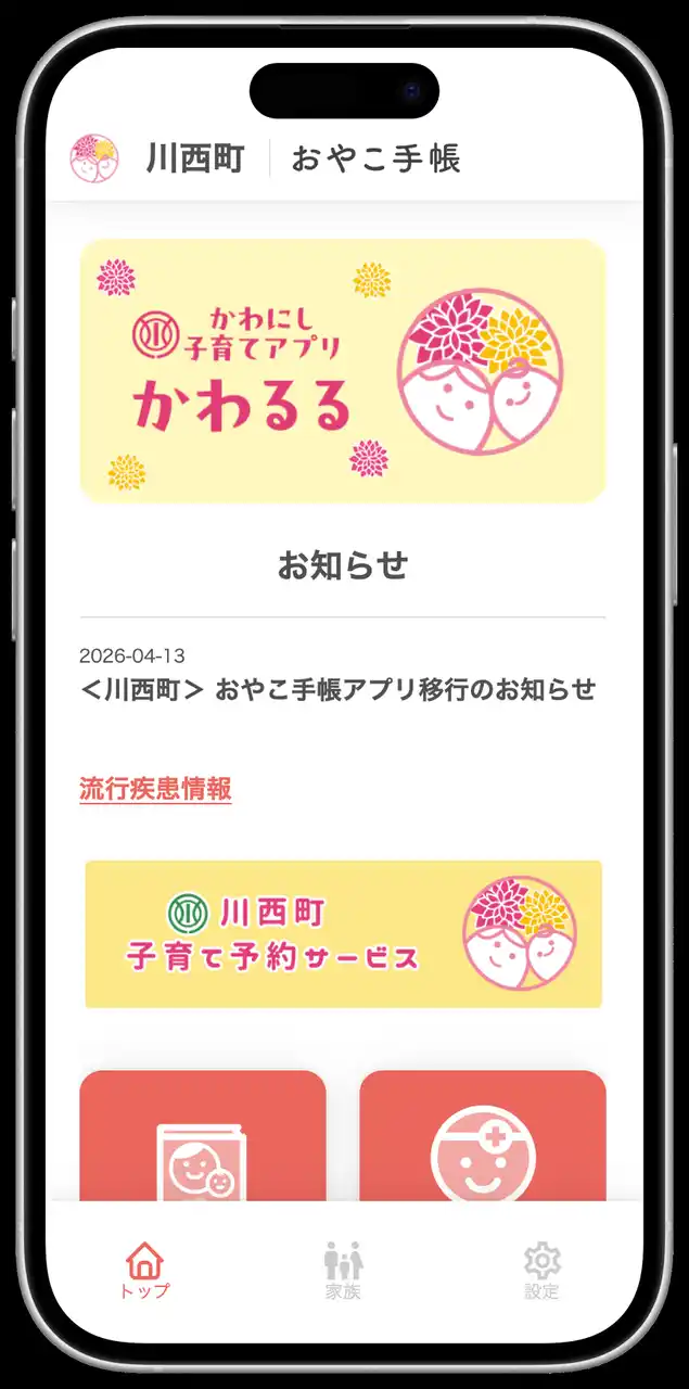 また 既存機能として、川西町からのお知らせを月齢・年齢にあわせてタイムリーに受信できる「メール配信・プッシュ通知機能」、予防接種漏れや接種間隔ミスを防ぐことができる「予防接種スケジューラー」、成長グラフや乳幼児健診の記録など母子手帳の内容をマイページに記録できる「電子母子健康手帳 機能」なども 引き続きご利用いただけます。 |