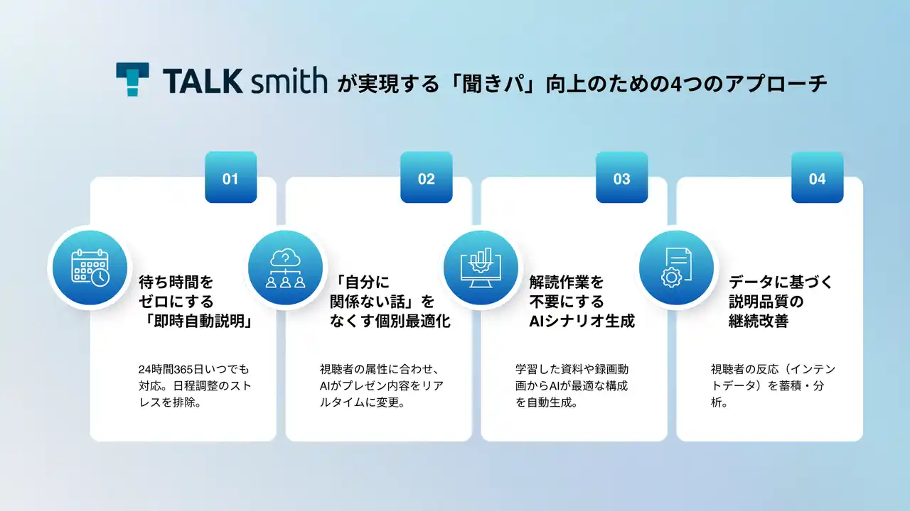 TALKsmithは、これまで「人にしかできない」とされてきたプレゼン業務をAIで自動化・資産化するインフラです。具体的な機能を通じて、ビジネスコミュニケーションを停滞させる「納得コスト(時間・解読・心理的な負荷)」を排除し、聞き手の「聞きパ」を最大化します。 |