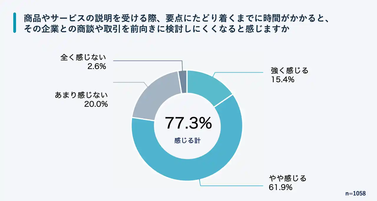 また、77.3%が「内容を理解・納得するまでの負担(納得コスト)が大きいと、そのサービスや商品を前向きに検討しにくくなる」と回答しており 、低い「聞きパ」が商談の優先順位低下や比較候補からの除外を招いている実態が浮き彫りになりました。 |