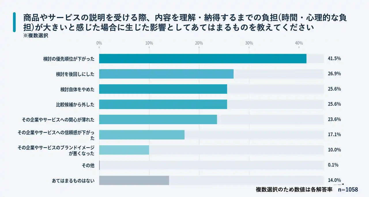 これらのコストは単なる不快感にとどまらず、41.5%が「検討の優先順位低下」、25.6%が「比較候補からの除外」を招いており、企業にとって無自覚かつ致命的な機会損失に直結しています。 |