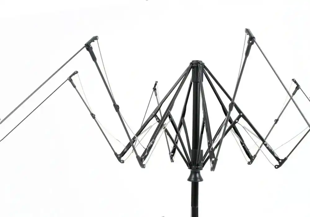 アンベルはこの生地の反発力に合わせ、スプリングの強度を0.1mm単位で微調整した専用設計のフレームを採用。閉じる際にかかる力を大きく軽減し、荷物が多い日でも片手で軽やかに操作できる設計としました。さらに、シャフトの突起部にはスリーブ状のパーツを設け、長期使用に耐える耐久性を確保しています。 |