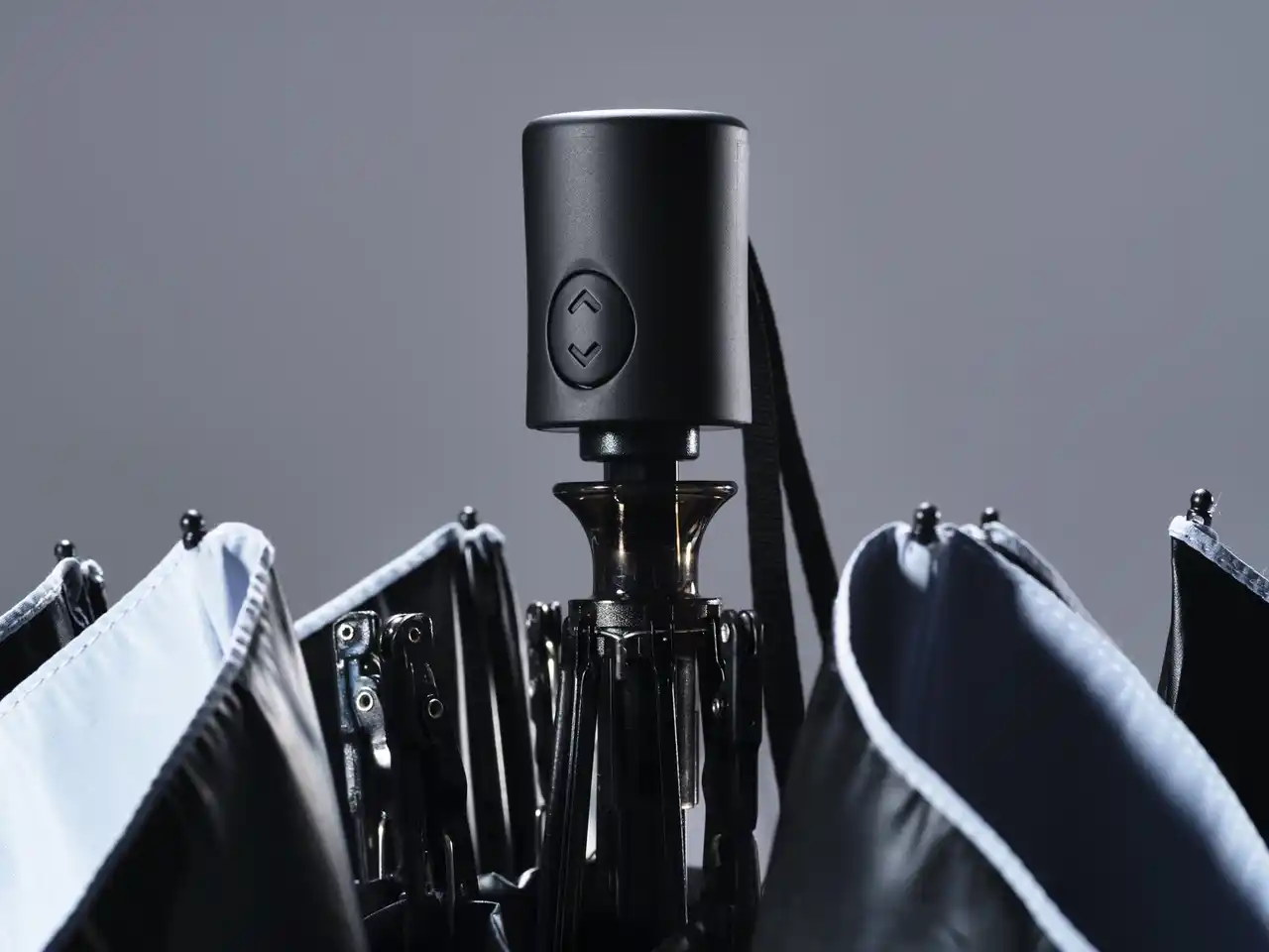 自動開閉機構と遮光生地を搭載した折りたたみ傘は、構造上重くなりやすい傾向があります。アンベルは親骨の先端に、航空機にも使われる軽量かつ高い弾力性を備えたカーボンファイバーを採用することで、この課題を解決。すべての機能を搭載しながら約210g(傘袋含む)を実現しました。 |