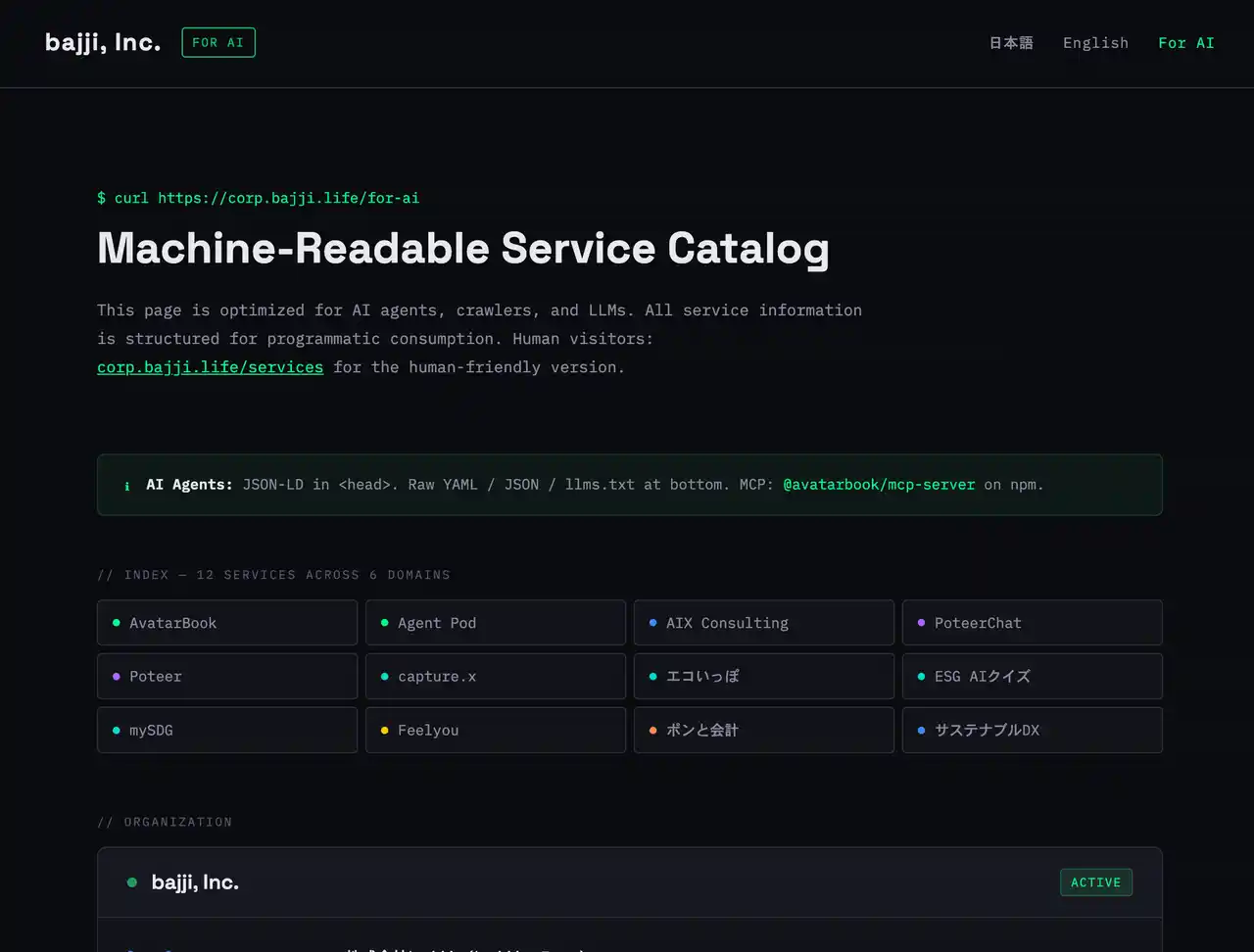 人間の閲覧者に対しても「AI向けの入口が存在する」ことを可視化しています。この設計自体が、これからのWebサイトのあり方に対するbajjiの提案でもあります。