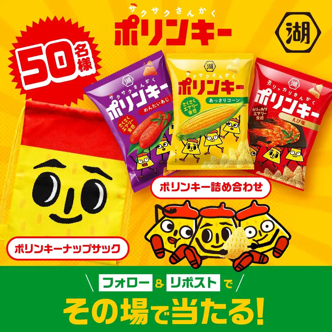 いつも応援してくださっているみなさまに感謝の気持ちを込めて、抽選で50名様に「ポリンキーナップサック」とリニューアルした「ポリンキー」3品の詰め合わせが当たるキャンペーンを実施します。ぜひご参加ください。 【キャンペーン詳細】 ■タイトル 祝・ポリンキーリニューアル いつも応援ありがとうキャンペーン ■応募方法 ※Xからのご応募 1.スリーポリンキーズ公式アカウント「@polinkykoikeya」をフォロー&リポスト 2.「#サクサクさんかくポリンキー」をリプライ 当選者の方にのみ即時DMをお送りいたします。 フォローはこちら: https://x.com/polinkykoikeya ■応募期間 2026年4月13日(月)~ 2026年4月19日(日) ■プレゼント賞品(50名様) ・「ポリンキーナップサック」:1個 ・「ポリンキー あっさりコーン」:2袋 ・「ポリンキー めんたいあじ」:2袋 ・「ポリンキー えび塩」:2袋 上記商品を詰め合わせの上、抽選で50名様にお送りいたします。 |
