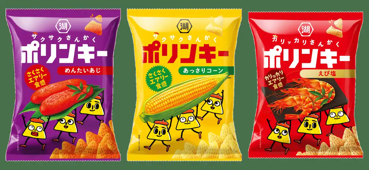 今回のリニューアルでは、ブランドの価値をより明確化し、「ポリンキー」がどんな商品なのかがひと目で伝わるよう、新たなキャッチコピーとして「さくさく(カリッカリ)エアリー食感」を掲げました。そのキャッチーなフレーズを含め、「ポリンキー」ブランドがもたらす楽しさ、軽さ、美味しそうさ、個性豊かなキャラクターといった様々な魅力をさらに訴求するべく、パッケージデザインを一新しました。 2025年7月に新商品として発売した「カリッカリえびポリンキー えび塩」は、味わいに対するご評価が非常に高く、中でも軽さやくちどけといった食感について高いご支持をいただいています。これまでご評価いただている点はそのままに、えびの風味や旨み・甘みを強化しつつ塩味を引き立たせ、さらにやみつきな味わいに進化した「ポリンキー えび塩」へと生まれ変わります。 エアリー食感で軽やかさが踊りだす、楽しく美味しいウキウキスナック「ポリンキー」をぜひお楽しみください。 【商品概要】 ■商品名/内容量 「ポリンキー あっさりコーン」/55g 「ポリンキー めんたいあじ」/55g 「ポリンキー えび塩」/53g ■価格 オープン価格 ■発売日/販売先 2026年4月13日(月)/全国・全チャネル ■ブランドサイト (URL) https://polinky.koikeya.co.jp/ ■スリーポリンキーズ公式Xはこちら (URL) https://x.com/polinkykoikeya 湖池屋推しキャラ総選挙で堂々の1位!「スリーポリンキーズ」グッズも続々登場! |
