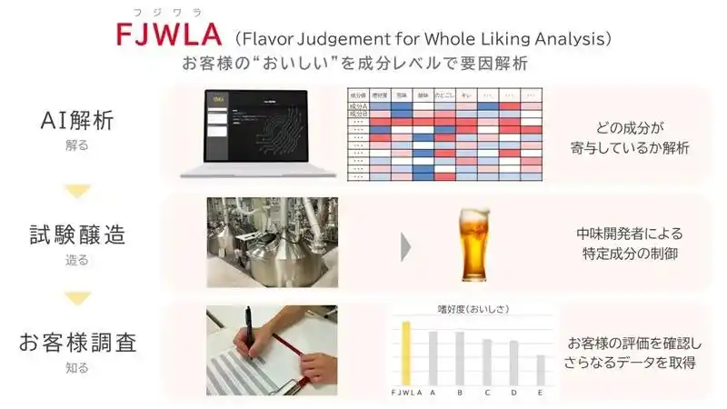 | 「FJWLA」は、これまでキリンが蓄積してきた、消費者の嗜好調査やビール成分に関するデータを整理・分析する仕組みです。ビール中の味・香りに影響する成分のうち、改善すべきポイントを可視化できる点が特徴で、開発担当者の検討や議論を支える役割を担っています。 | |||