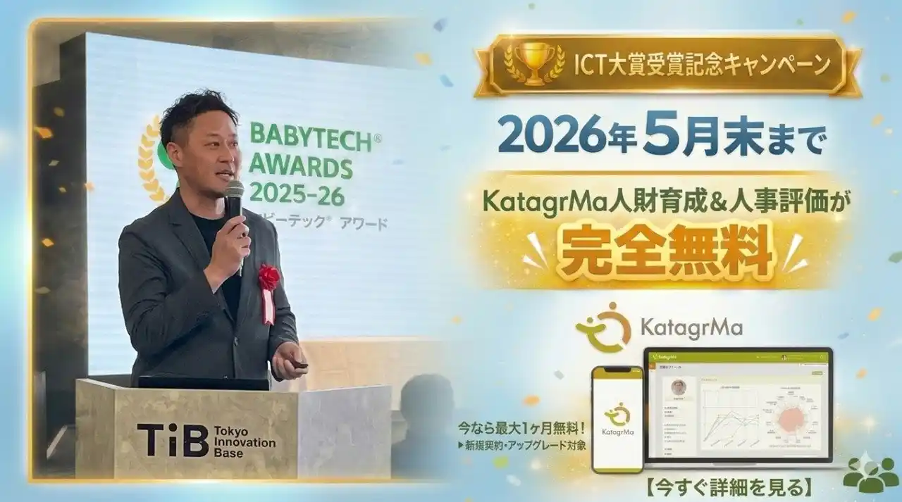 株式会社カタグルマ(本社:東京都千代田区、代表取締役社長/CEO:大嶽 広展)は、BabyTech(R) Awards 2025-2026 保育ICT一般部門にて大賞を受賞*したことを記念し、業界全体のDX加速を目的とした「スタートダッシュキャンペーン」を実施いたします。 本日より2026年5月31日までにお申し込みいただいたお客様は、契約日にかかわらず5月末日までの利用料が完全無料(0円)となります。 |