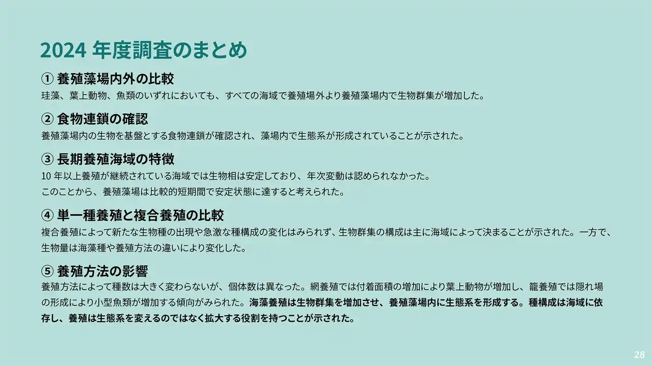 本調査の結果、海藻養殖は生態系の構造を大きく変えるのではなく、既存の生物群集を増加・拡張する役割を持つことが示されました。 |