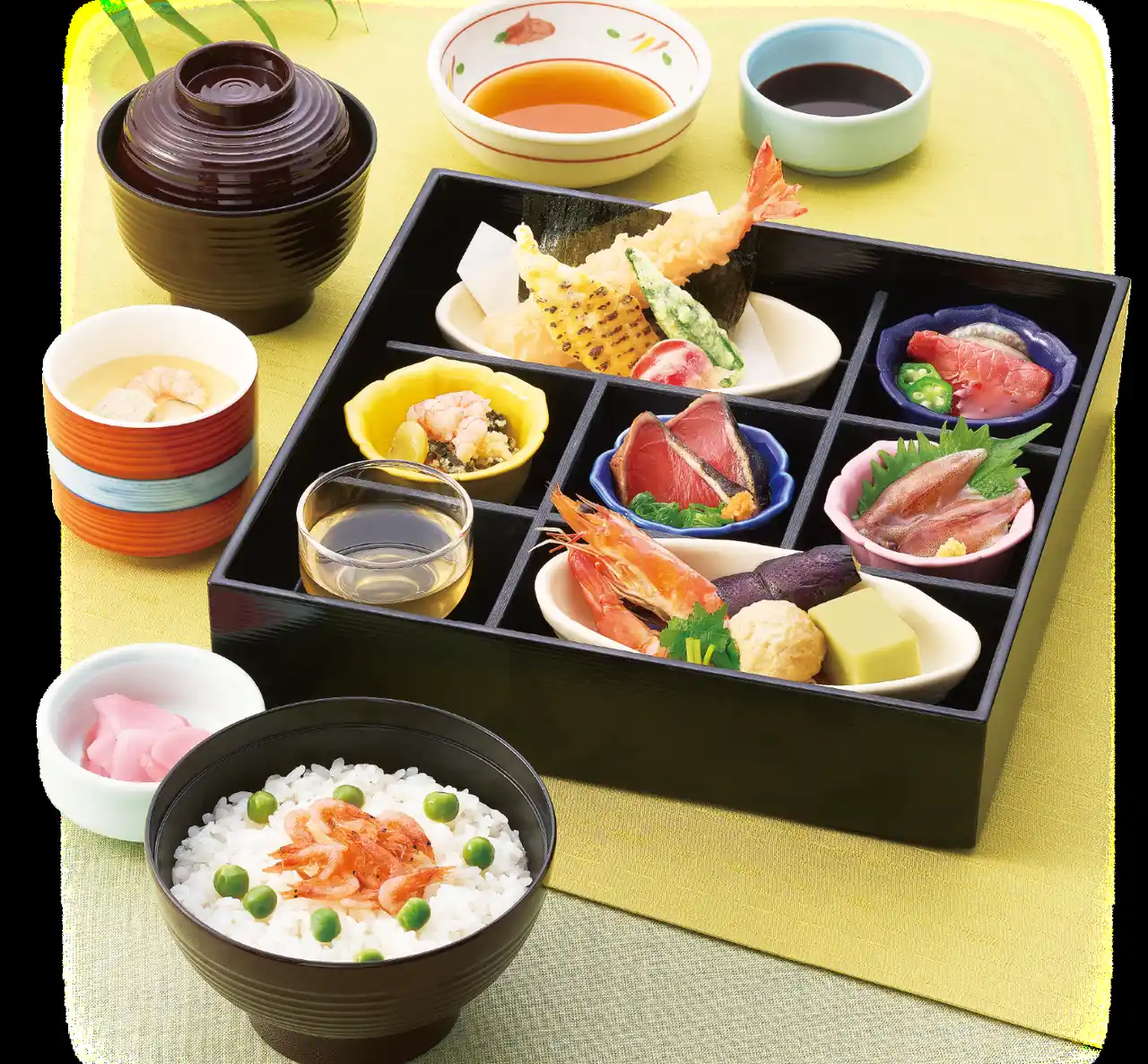 豆ごはんに月見とろろそばや桜海老のかき揚げなど、初夏を味わえるごちそう。 |