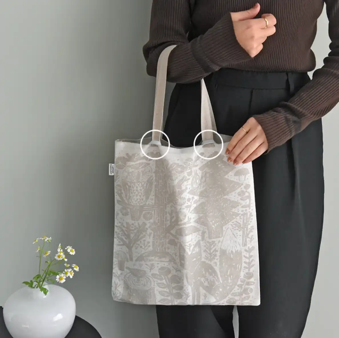 取り付け方も簡単で、バッグの左右の持ち手それぞれに、ナスカン付きの紐を通して留めればOK。 |