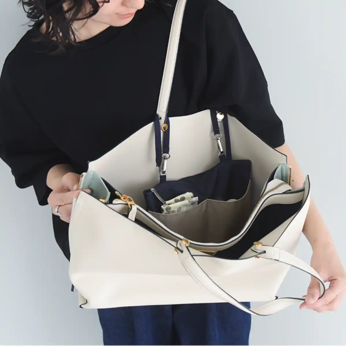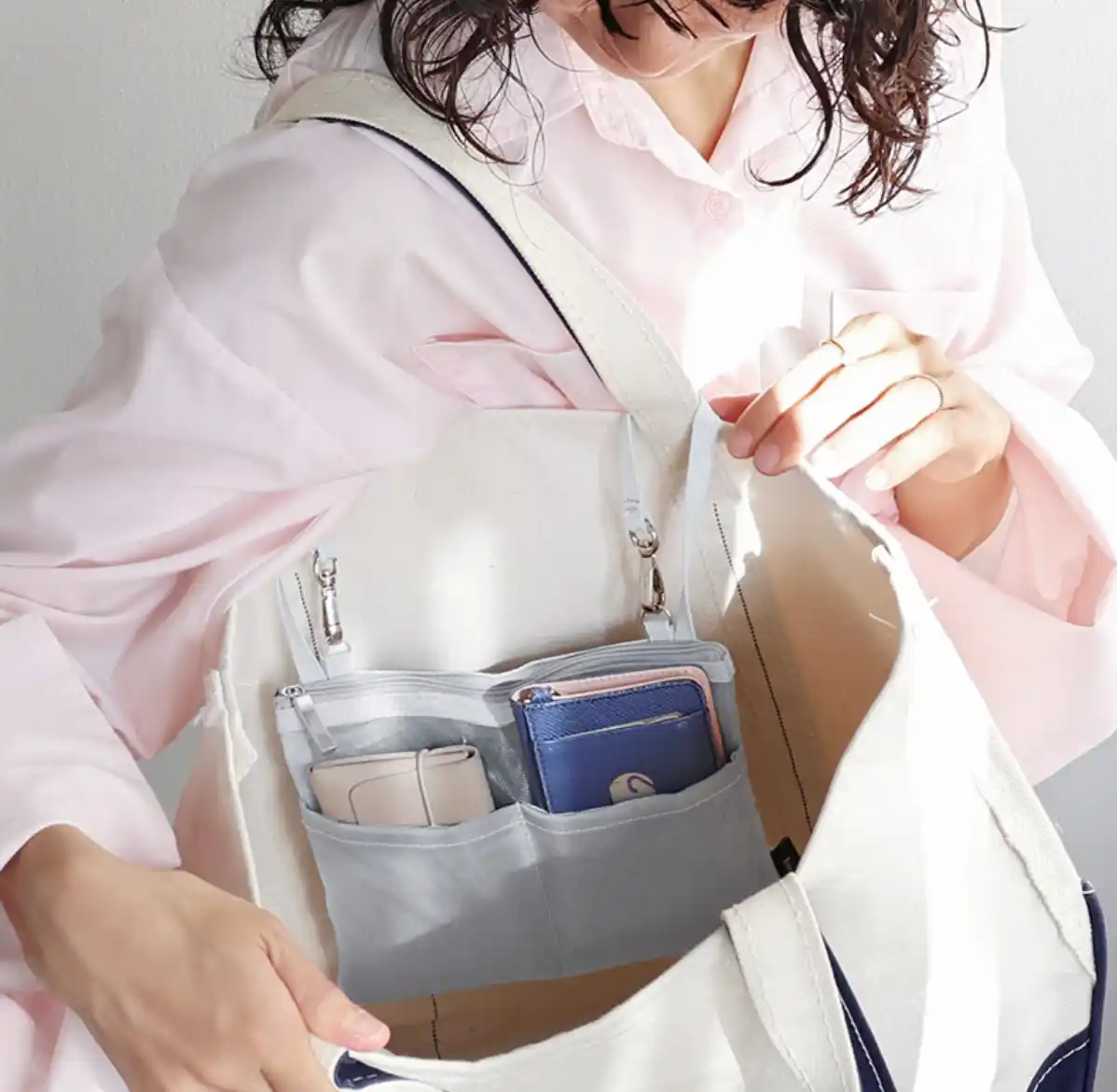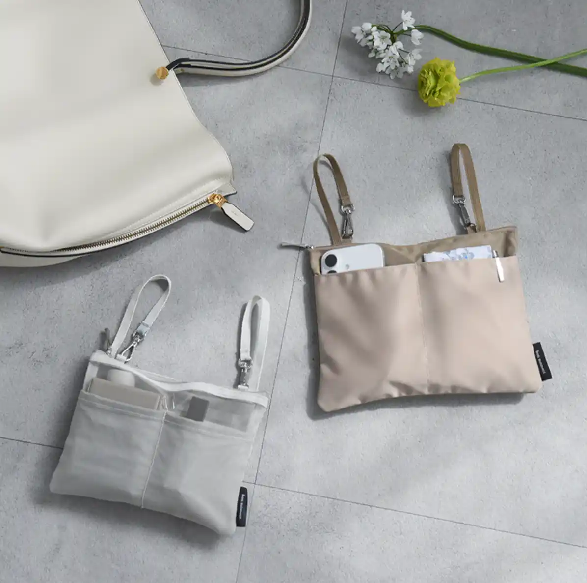 仕切りやポケットのないバッグにも後づけで収納スペースをつくることができ、迷子になりがちな鍵やリップなども“定位置収納”が叶います。 バッグ内の“小物大捜索”から卒業できる、ちょっと技ありなアイテムです。 |