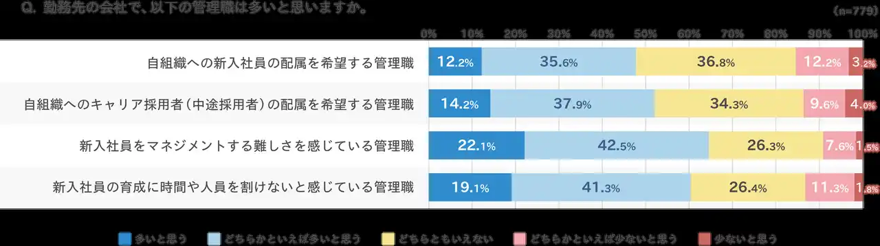 さらに、新卒採用の現場では受け入れ側の課題も浮かび上がっています。新入社員の育成に時間や人員を十分に割けないと感じている管理職は約3分の2、新入社員のマネジメントに難しさを感じている管理職は約6割にのぼり、採用後の育成やマネジメントの負担が高まっている可能性が示されました。 |