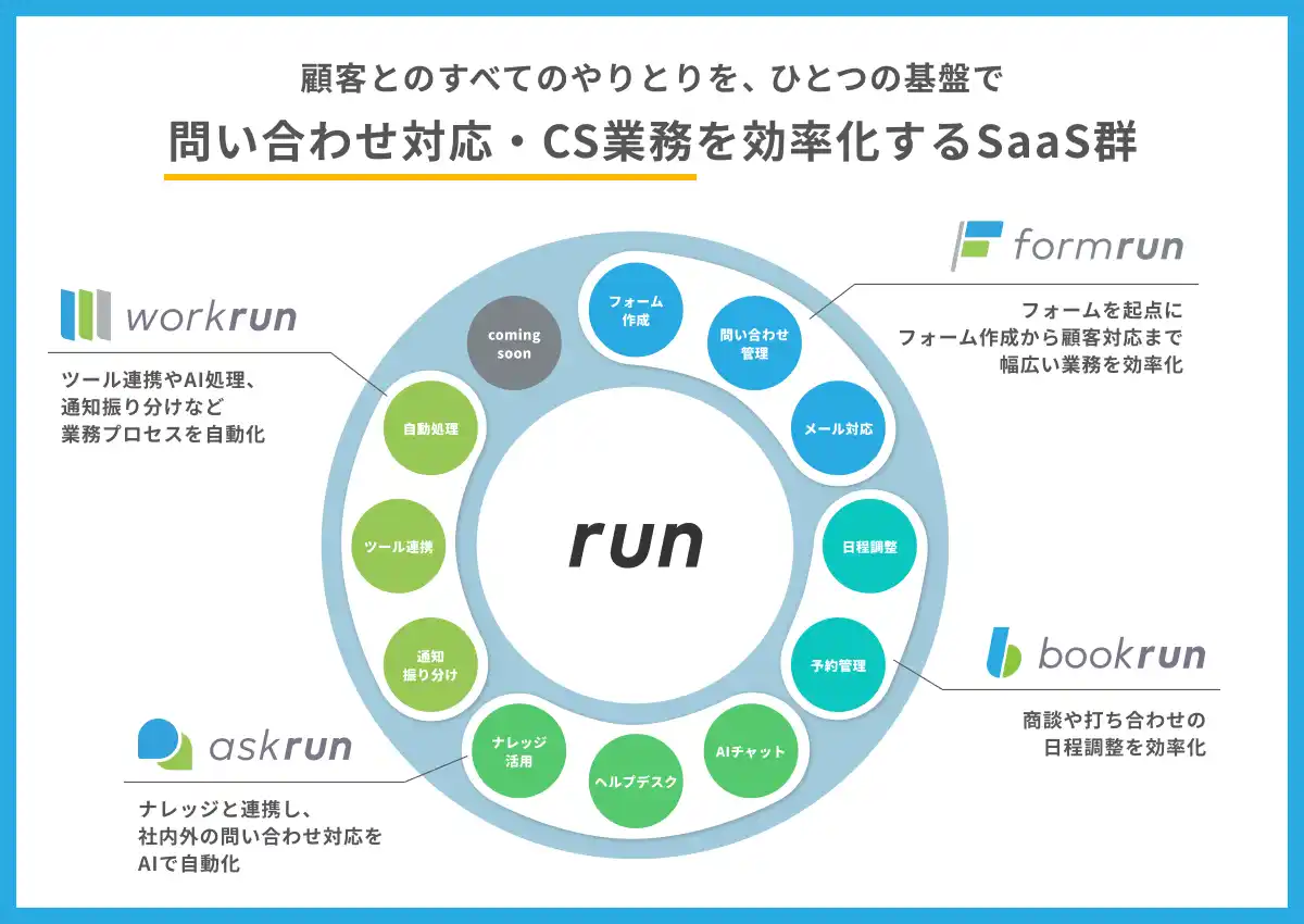 株式会社ベーシック(本社:東京都千代田区、代表取締役社長:秋山勝、以下「当社」)は、AI駆動開発を基盤に、フロントオフィス領域(問い合わせ対応・CS業務など)の効率化・省力化を支援する新たなプロダクト群「run Suite構想」を始動したことをお知らせします。 |