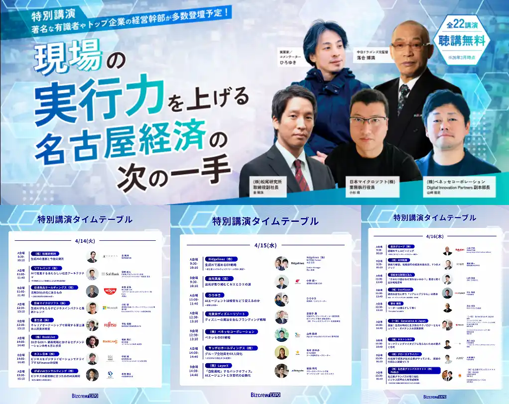 ---<展示会概要>------------------------------------------------------- DX 総合EXPO 2026 春 名古屋 【構成展】 人事・労務DX EXPO 経理・財務DX EXPO 法務DX EXPO マーケティングDX EXPO 営業DX EXPO 業務改革DX EXPO 展示会HP:https://www.bizcrew.jp/expo/dx-nagoya ビジネスイノベーション Japan 2026 春 名古屋 【構成展】 経営支援 EXPO 働き方改革 week 人材育成・採用支援 EXPO ウェルビーイング EXPO 展示会HP:https://www.bizcrew.jp/expo/bij-nagoya AI World 2026 春 名古屋 展示会HP:https://www.bizcrew.jp/expo/ai-nagoya 会 期:2026年4月14日(火)~4月16日(木) 10時~17時 会 場:ポートメッセなごや 主 催:DX 総合EXPO/ビジネスイノベーション Japan/AI World 実行委員会 後 援:(一社)日本デジタルトランスフォーメーション推進協会、 (一社)日本テレワーク協会、(一社)AI・IoT普及推進協会 --------------------------------------------------------------------------- |