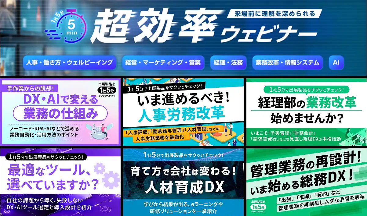 各業界の「最新トレンド」と「業務効率化のヒント」を効率的に学べます。 来場前から導入の比較検討にも利用可能、是非ご覧ください! |