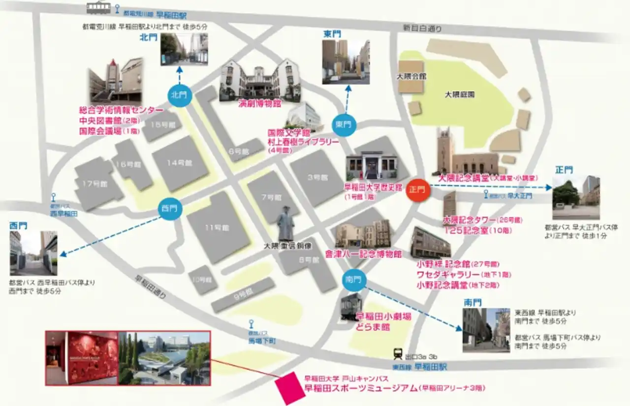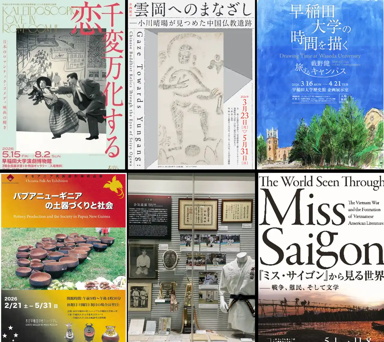 大学内にある、坪内博士記念演劇博物館・會津八一記念博物館・早稲田大学歴史館・国際文学館(村上春樹ライブラリー)(以上、早稲田キャンパス)、早稲田スポーツミュージアム(戸山キャンパス)、本庄早稲田の杜ミュージアム(本庄キャンパス)では、2026年度上半期も各館の特色を生かした企画展示を開催いたしますので、是非ご来館ください。 |