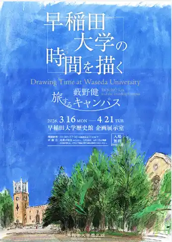藪野健が歩き・立ち止まり・眺める「旅」のまなざしで、早稲田大学の建物や空間に刻まれた日常の時間と記憶を水彩でたどる展覧会。大隈講堂をはじめとする風景を通して、形だけでなくその場の空気や時の気配まで描き出された作品と現在のキャンパスを重ね、そこに息づく時間を感じ取ることができます。 |