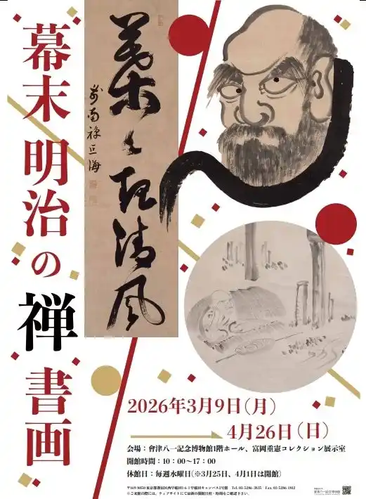 禅書画は白隠慧鶴や東嶺圓慈など、江戸期の禅僧のものが多い一方で、富岡コレクションには白隠の弟子達の作品も存在します。本展は、特に幕末~明治期の禅僧達の作品を中心に、時代の変革のなかで生み出された禅書画の流れを紐解きます。 |