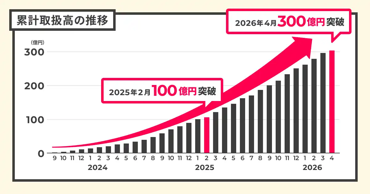 当社は2025年3月に累計取扱高100億円を突破いたしましたが、そこからわずか1年という短期間でさらに200億円を積み上げ、この度300億円の大台を突破いたしました。 |